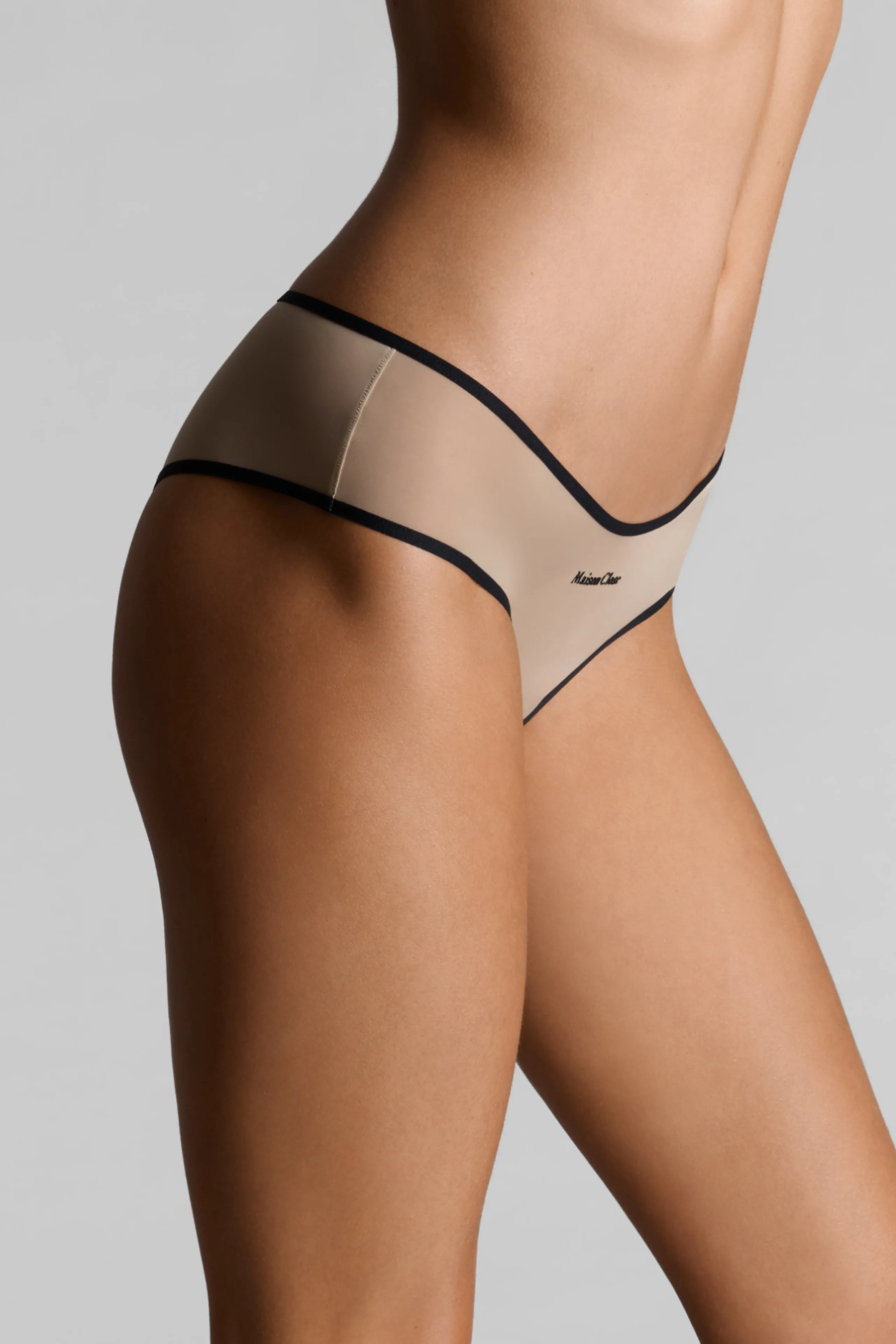 Hipster en microfibre effet seconde peau, avec une coupe légèrement plus couvrante sur les hanches. La matière suit le corps sans marquer. Les bords sont soulignés d’un élastique ultra plat contrasté, pour une finition nette. Logo Maison Close en relief au dos. Confort absolu, allure chic.